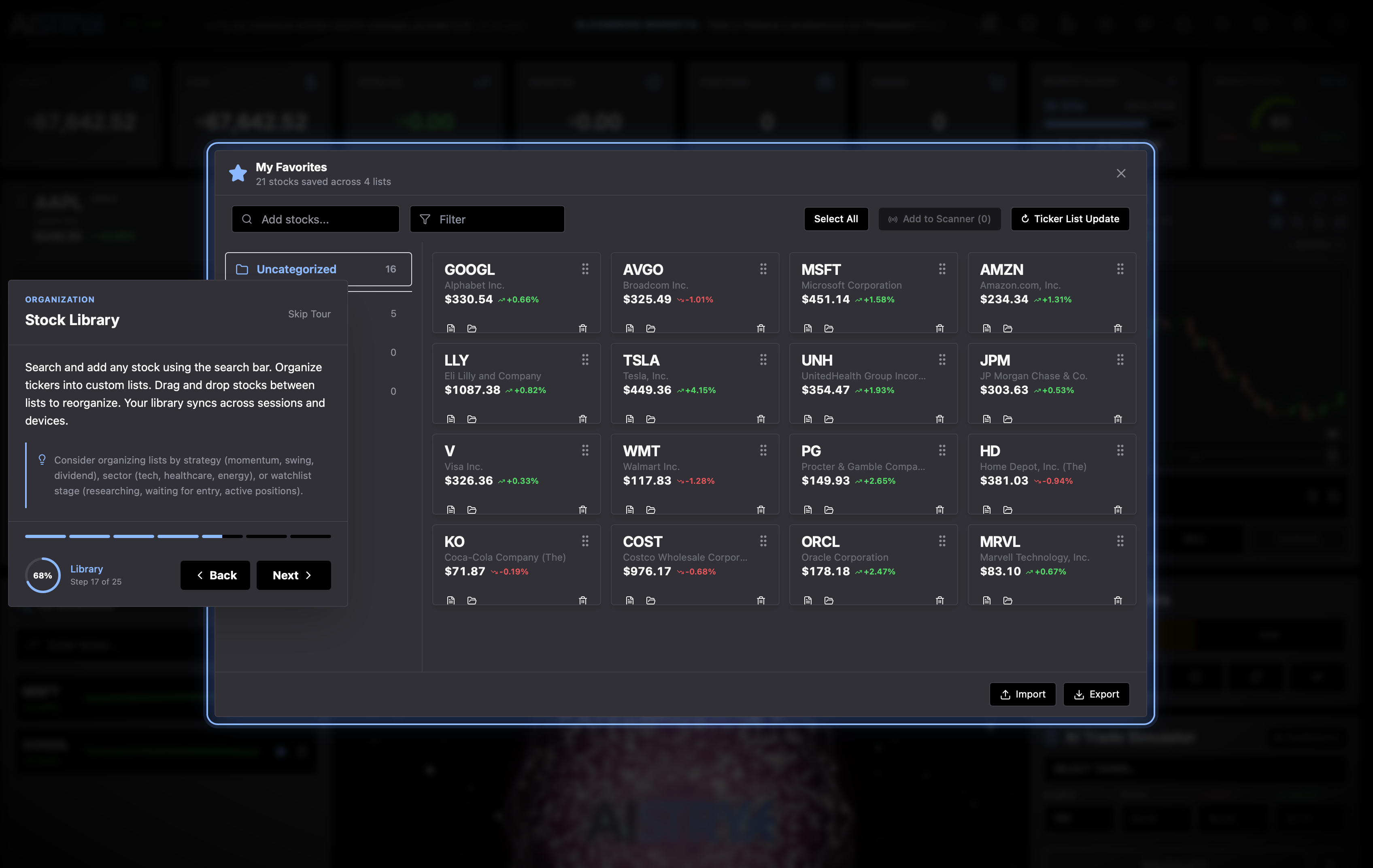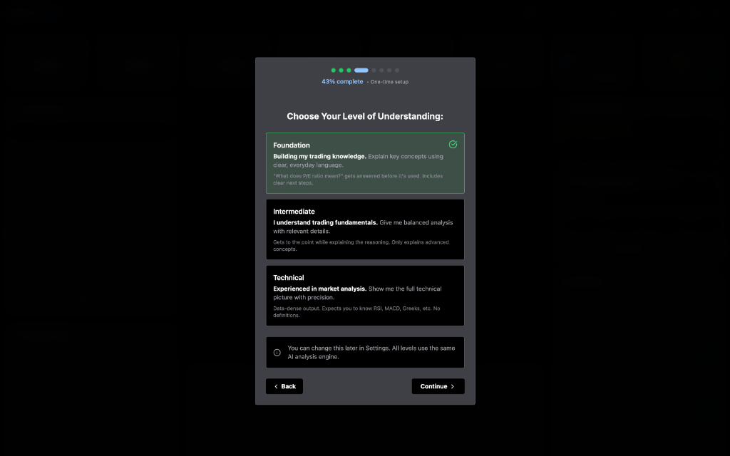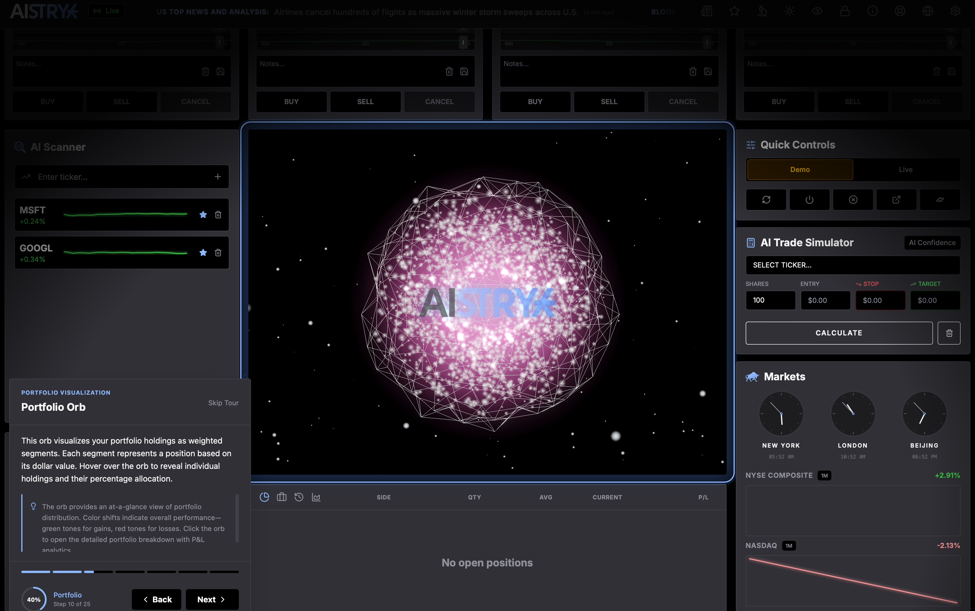 Once setup is complete, AISTRYX offers an interactive guided tour that highlights every feature of the interface. The app teaches you how to use it — no manual required. Follow the spotlight prompts to discover the AI scanner, portfolio visualizer, chart analysis, and more.